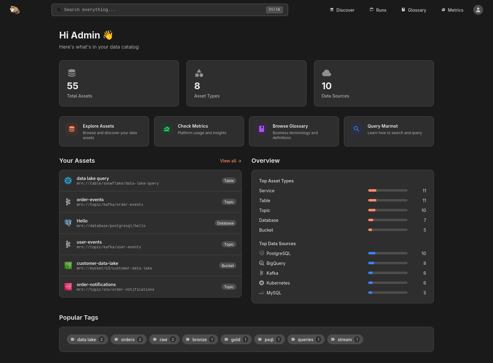 Marmot runs as a single binary backed by PostgreSQL - the only dependency you need to start cataloging your data.