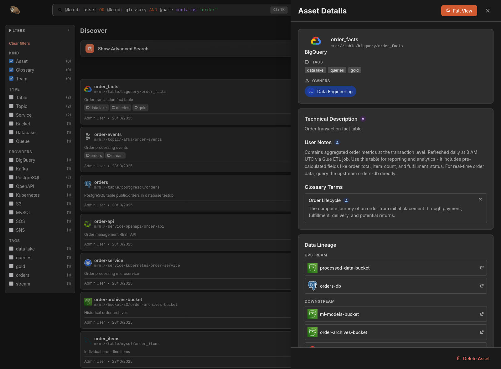 The open-source data catalog for modern teams. Search tables, topics, queues, buckets, APIs, and more - all in one place.
