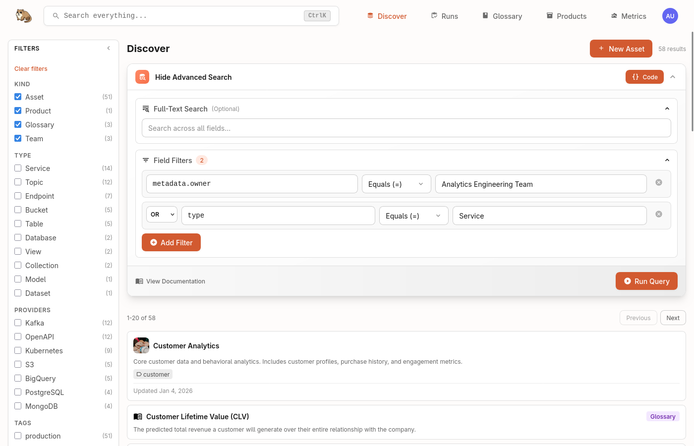 The query language is entirely optional. Simple free-text searches work well for everyday discovery. When you need precision, such as finding all Kafka topics owned by a specific team or tables with more than a million rows, the query language gives you that control. Queries are also repeatable and shareable, making it easy to bookmark common searches or share them with your team.